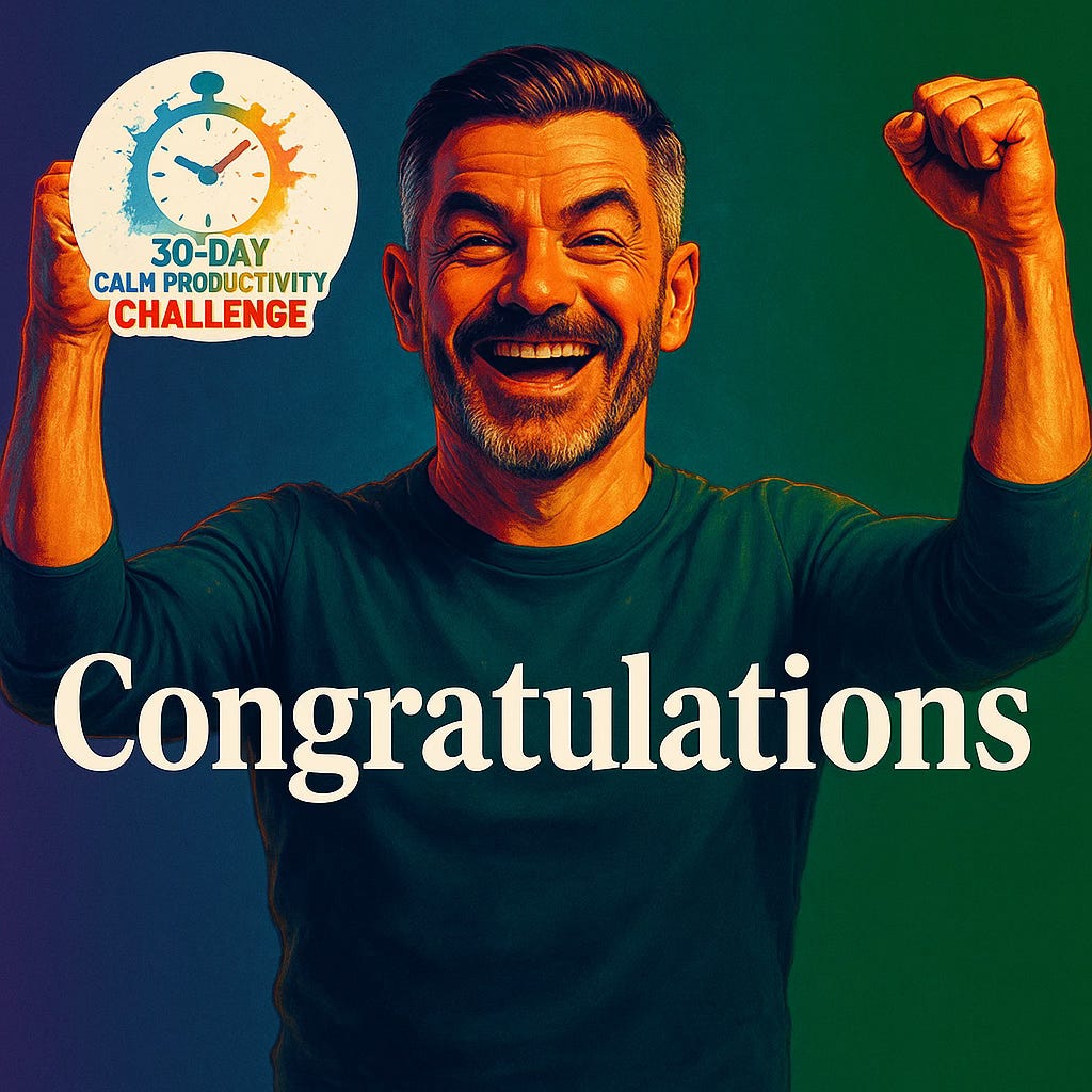 You did it! 30 days of calm-productivity habits. Whether you completed every mini-task or missed a few, today is about celebrating your commitment to progress.